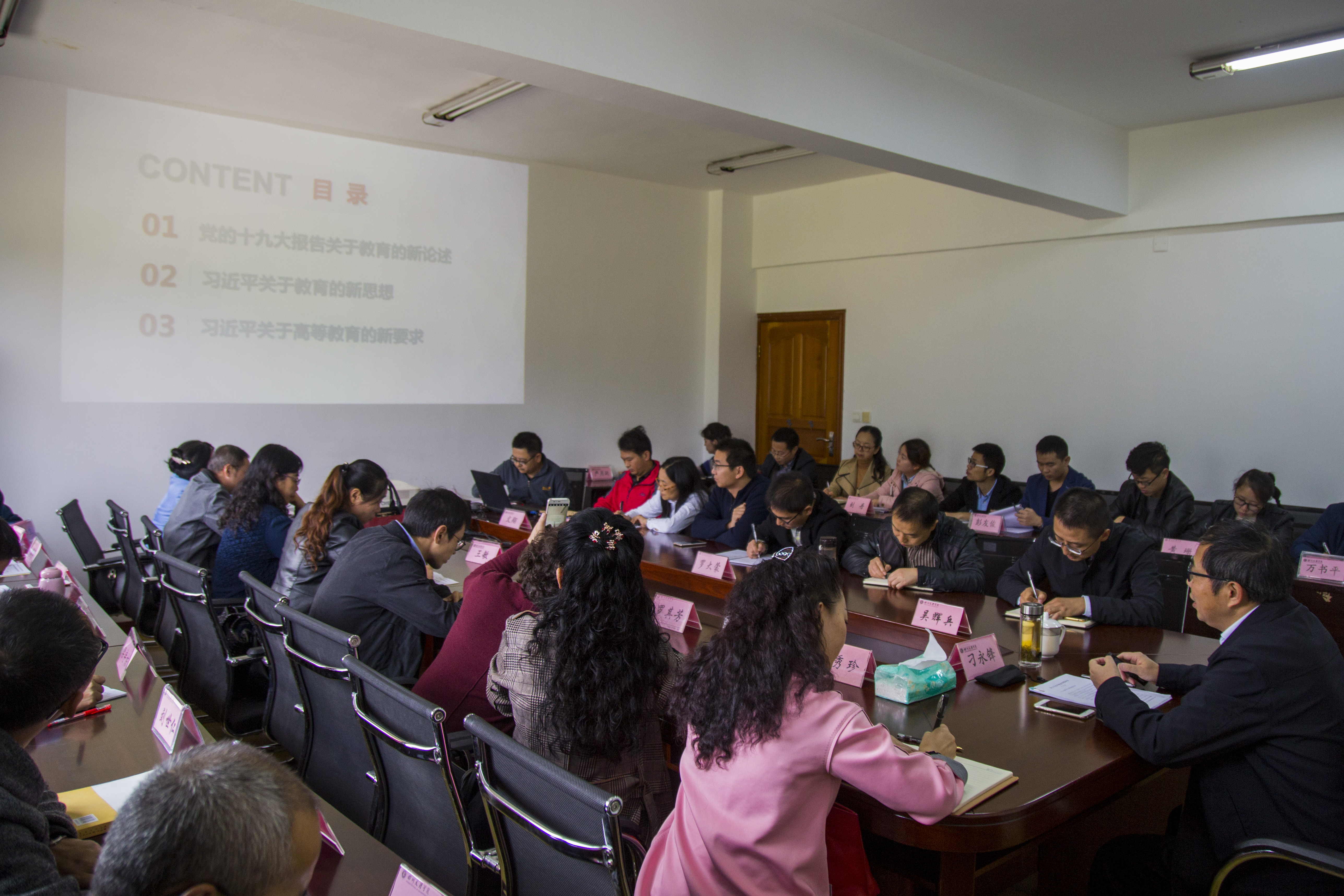 第一,党的十九大报告关于教育的新论述。首先明确了社会主义教育事业的总体方向以及不同阶段对教育提出的新要求,并不断增强教育对社会的作用;然后指明高等教育的任务、新成就和教育发展的不平衡、不充分性。其中,新时代高等教育的任务主要表现为实现内涵式发展,培养更多的一流人才。而教育的新成就则突出表现在五个方面:一是教育总体水平已经进入世界中上行列,二是教育质量明显提高,三是教育发展的条件有了历史性改变,四是教育国际影响力明显增强,五是教育改革全面深化。从这五个方面成就,我们能看到中国教育的明天更加灿烂辉煌。第二,习近平总书记关于教育的新思想。从六个方面阐述了教育的重要性。重点解读了习近平总书记提出的教育改革的“九个坚持”;并结合自己学习习近平教育思想的几点体会与学院全体教师作了分享。第三,习近平总书记关于高等教育的新要求。讲到习近平总书记指出高等教育的几个重要问题,关于党的教育方针的新描述、新说法,怎样培养人才的新要求等。重点强调了习近平总书记关于高等教育的卓越观,提出了教师应言传身教,特别是要培养德才兼备的人才等相关内容。