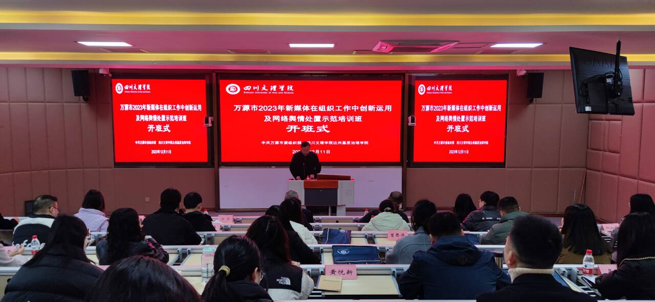12月11日,万源市2023年新媒体在组织工作中创新运用及网络舆情处置示范培训班开班仪式在四川文理学院顺利举行。此次培训班由万源市委组织部主办,四川文理学院达州基层治理学院承办。四川文理学院党委常委、副校长徐晓宗致辞、万源市文化体育和旅游局副局长朱小平讲话,金年会jinnianhuicom院长、达州基层治理学院副院长孙杰主持开班式。