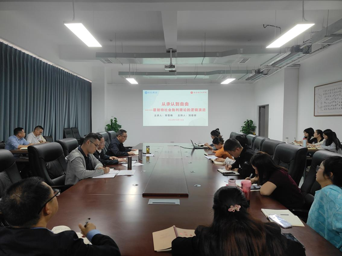 为提升学院教师科研能力,营造良好学术氛围,10月16日,邓雪梅博士为全体教师作《从承认到自由——霍耐特社会批判理论的逻辑演进》的学术讲座,讲座由学院党委书记刘春辉主持。