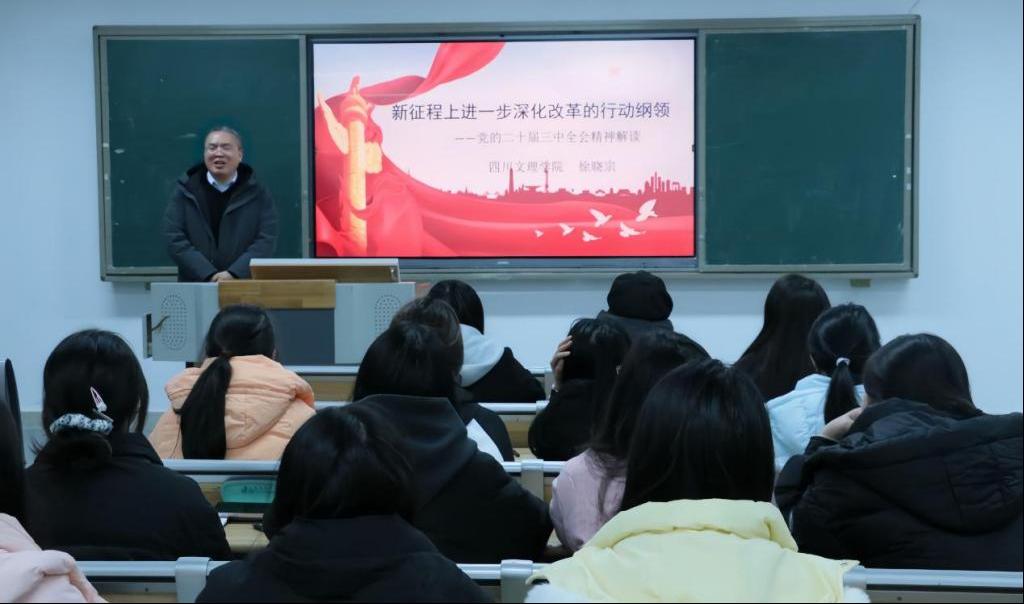 为引导广大师生将思想和行动统一到党的二十届三中全会精神上来,进一步激发青年学生昂扬斗志,勇担时代使命,12月16日,学校党委副书记徐晓宗教授在莲湖东区B110教室,以《新征程上进一步深化改革的行动纲领——党的二十届三中全会精神解读》为题,为政法学院知识产权学院全体辅导员及部分学生讲授形势与政策课。