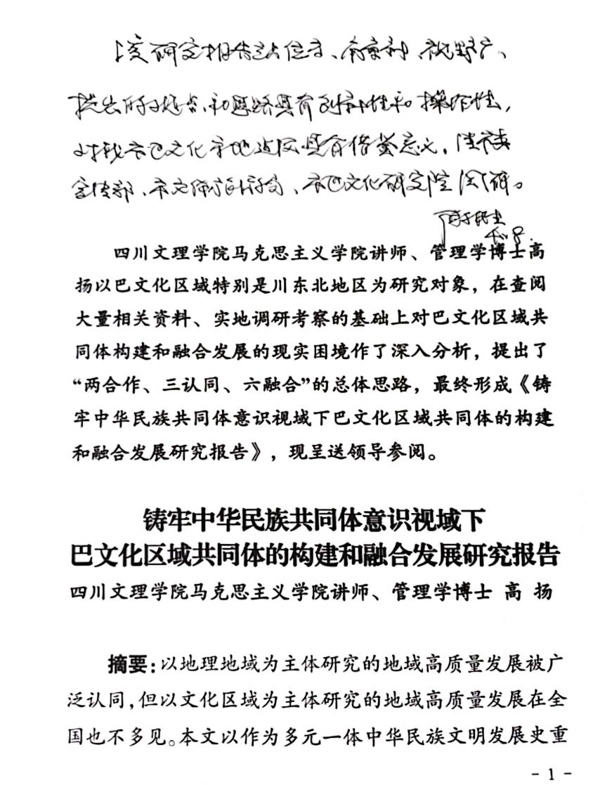 近日,金年会高扬博士撰写的《铸牢中华民族共同体意识视域下巴文化区域共同体的构建和融合发展》研究报告获得达州市委常委、宣传部长陈文胜同志的肯定性批示。