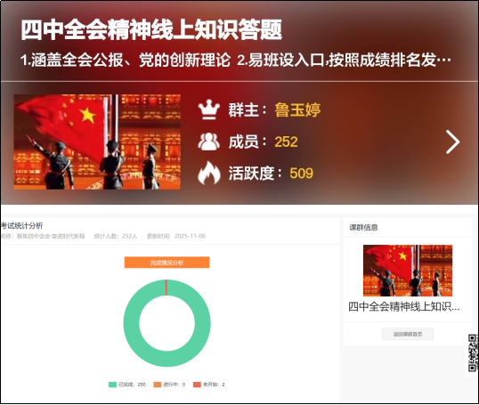 以赛促学:筑牢理论认知根基。“聚焦四中全会・奋进时代新程”知识竞赛于10月下旬率先在线上启动,依托易班平台打造智能化学习场景。竞赛题库紧扣全会核心要义,通过梯度化题型设计实现从基础识记到深度理解的层级考查。线上答题模式打破时空限制,参赛同学自主选择时段参与答题,最终结合准确率与完成速度评选出16名优秀选手。竞赛让“高水平科技自立自强”等战略部署从文件术语变成了清晰认知。以赛促学的形式有效激发了学生主动学习热情,形成比学赶超的学习氛围。