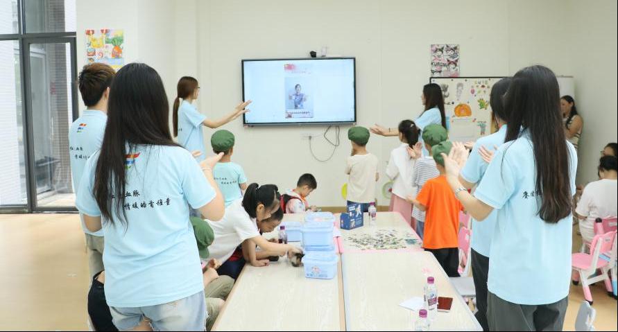 下午,团队前往庙沟河社区的阳光驿站。团队为驿站的孩子们赠送了礼物,并提供了丰富多彩的陪伴关爱服务。首先,团队组织孩子们在室外开展游戏活动。伴着欢快的旋律,团队带领孩子们一起跳舞,并利用音乐暂停规则开展游戏活动。接下来,团队在室内引导孩子们充分发挥想象力,用扭扭棒、橡皮泥创造出一个个生动有趣的作品。最后,团队教孩子们学习共产儿童团歌及手势舞,在欢声笑语中将红色的种子埋入孩子心间。