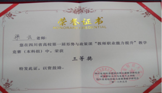 在刚刚结束的四川省首届高校形势与政策课“教师职业能力提升”教学竞赛中,金年会梁云老师取得优异成绩,斩获四川省三等奖。本次教学竞赛由四川省高校思想政治理论课教学研究会主办、西南财经大学金年会jinnianhuicom承办、四川省高校形势与政策课教学研究会协办,系我省首次针对高校形势与政策课所展开的竞赛活动。