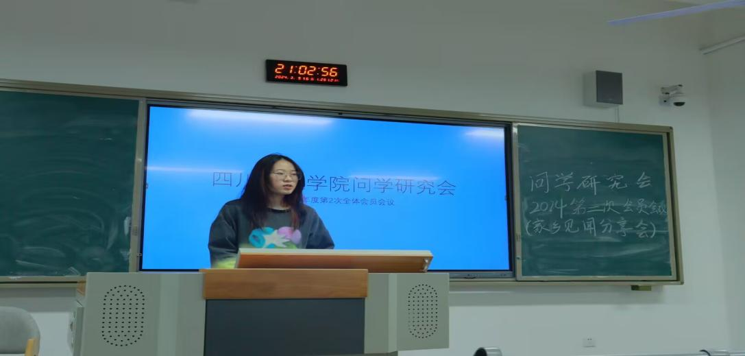 首先,社团成员分别汇报了各自的家乡见闻。团支书罗永倩对家乡见闻活动的总体情况做了简单的总结,介绍了自己的家乡的特产及风俗舞蹈,社团负责人杨镧介绍了小金的自然风光、实地调研后对服饰文化的总结,会员张宇欣同学介绍了家乡自贡的城市发展及社区周边的变化,巫华群同学介绍了家乡人才现状及宗族祠堂的发展,张沁同学介绍了西昌邛海及古镇的现状,吴星润同学介绍家乡城市变化及政策对农村的影响,梅寒香同学回家乡探析朝天旅游城市发展的原因。本次活动共有15名同学参加并提交见闻心得体会,共考察实践近20个县城、村镇、社区,如:重庆、朝天、阿坝州、自贡、温江。每一位同学对自己的家乡见闻都有深入浅出的理解,在家乡发展方向上,纵深探析原因,实地感受周边变化,活动氛围一度达到高潮。