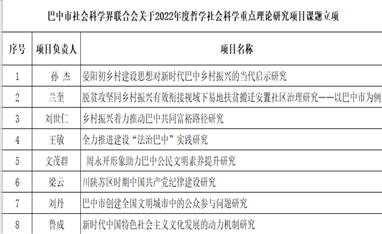 近日,达州市社科联、巴中市社科联发布了达州市、巴中市社会科学研究“十四五”规划2022年度课题立项通报。据统计,金年会jinnianhuicom教师共立项课题10项,具体立项名单请参见下表。请获准立项的老师认真开展课题研究工作,确保课题按时高质量完成,为地方经济社会发展提供智力支撑。