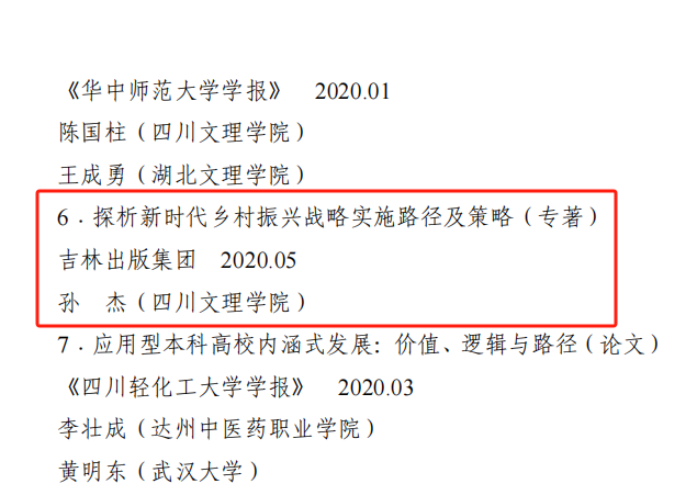 学院院长孙杰专著《探析新时代乡村振兴战略实施路径及策略》与学院副院长何先成专著《唐代神策军与神策中尉研究》荣获达州市第十七次社会科学优秀成果奖一等奖。张善喜老师论文《习近平劳动观的逻辑诠释》荣获达州市第十七次社会科学优秀成果奖三等奖。