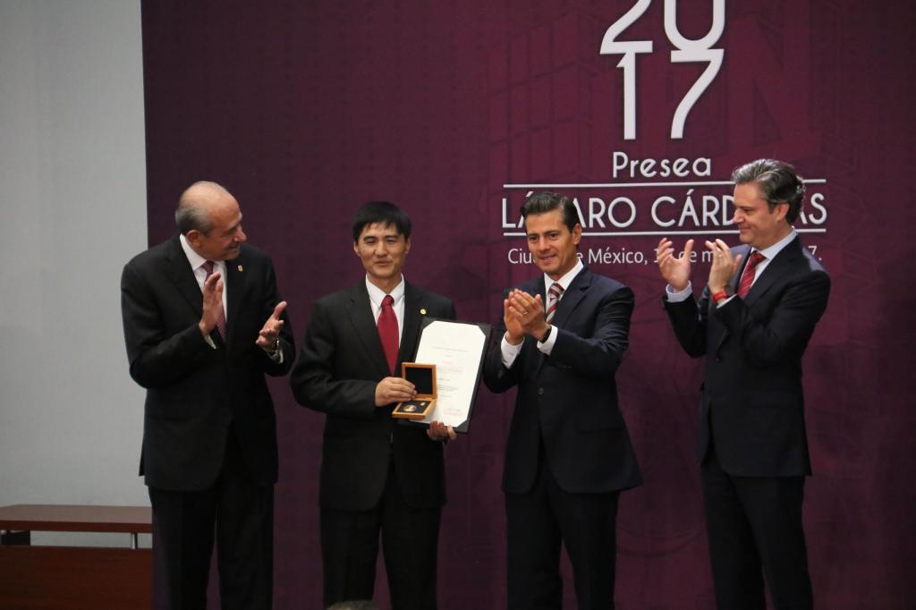 当地时间5月19日,2017年墨西哥国立理工大学拉萨罗•卡德纳斯总统奖颁奖仪式在墨西哥总统府隆重举行,墨西哥总统培尼亚•涅托亲自为获奖者颁奖。kaiyun开云杰出校友、现年47岁的墨西哥科学院院士和华人物理学家董世海教授名列其中,他也是迄今为止墨西哥国立理工大学最年轻的杰出教授。